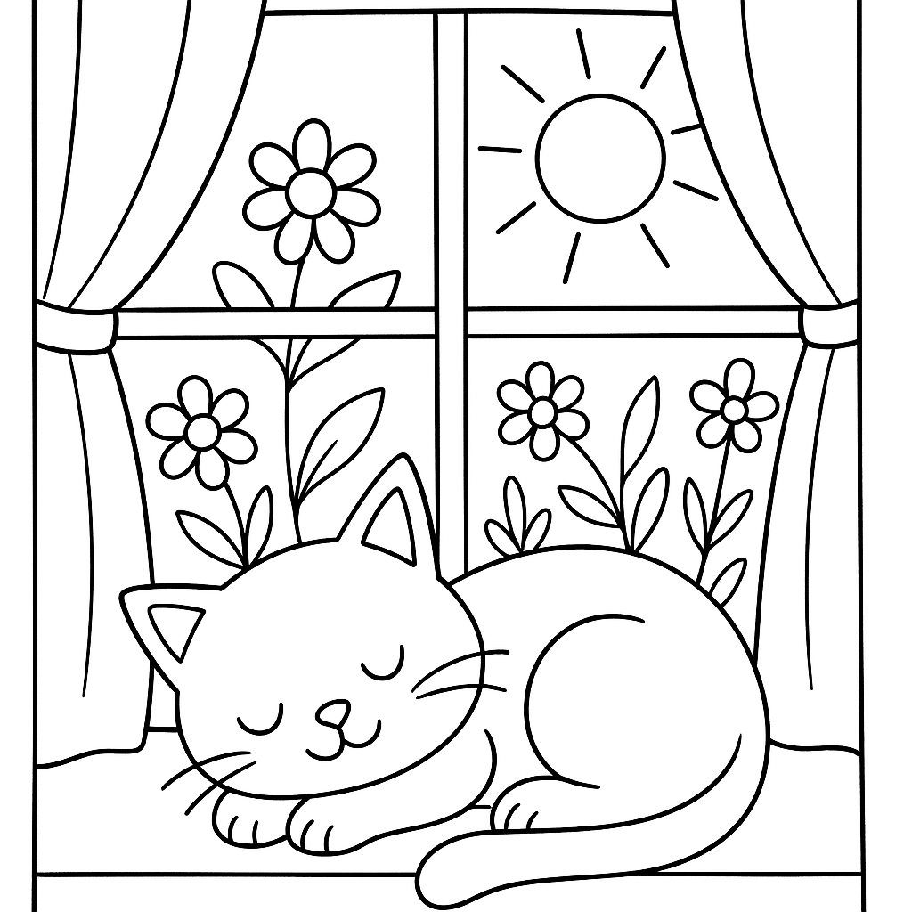 A medium coloring page featuring a cat napping in a sunny window with flowers outside. Perfect for kids (6-9) with moderately detailed outlines for a fun coloring experience.
