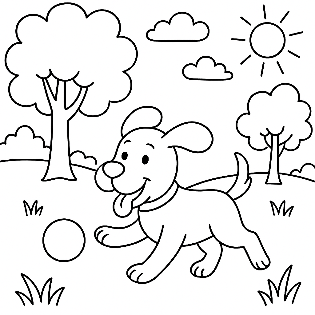 A simple coloring page featuring a dog playing fetch in a spring park. Perfect for kids (4-6) with large, bold outlines for a fun coloring experience.