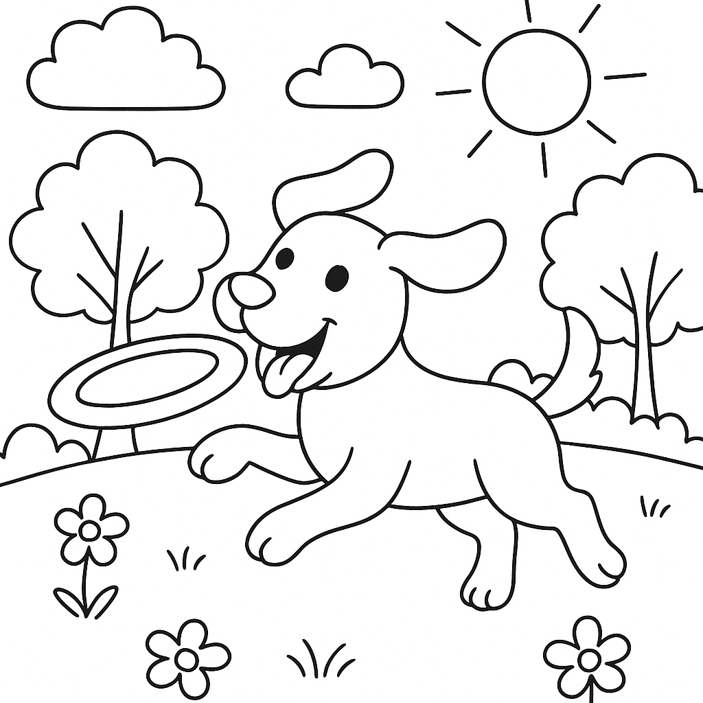 A simple coloring page featuring a dog playing with a frisbee in a spring park. Perfect for kids (4-6) with large, bold outlines for a fun coloring experience.