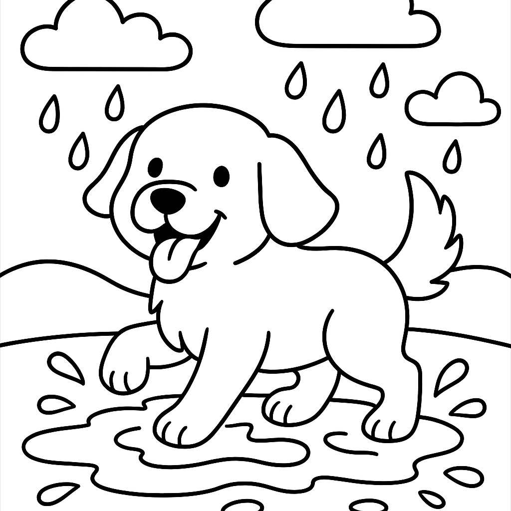A simple coloring page featuring a golden retriever playing in a puddle after spring rain. Perfect for toddlers (2-4) with large, bold outlines for a fun coloring experience.