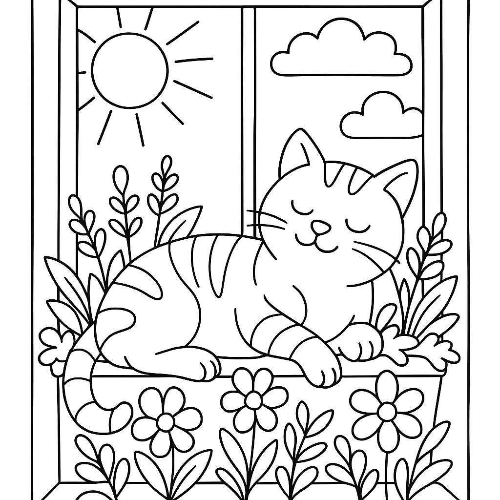A medium coloring page featuring cat lounging in a sunny window box garden. Perfect for kids (6-9) with moderately detailed outlines for a fun coloring experience.
