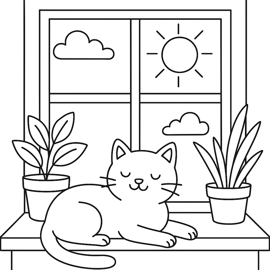 A simple coloring page featuring cat lounging in sunny window with plants. Perfect for kids (4-6) with large, bold outlines for a fun coloring experience.