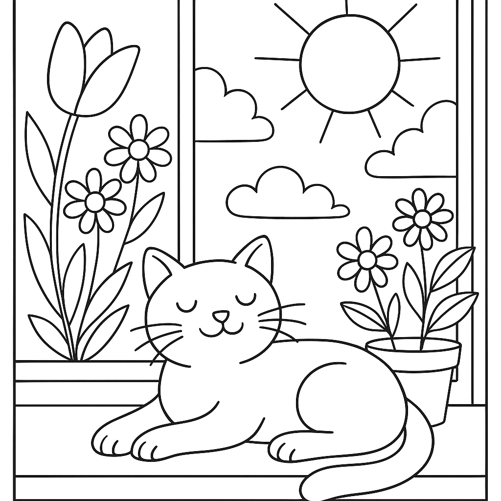 A medium coloring page featuring cat sunbathing by window with spring flowers. Perfect for kids (6-9) with moderately detailed outlines for a fun coloring experience.