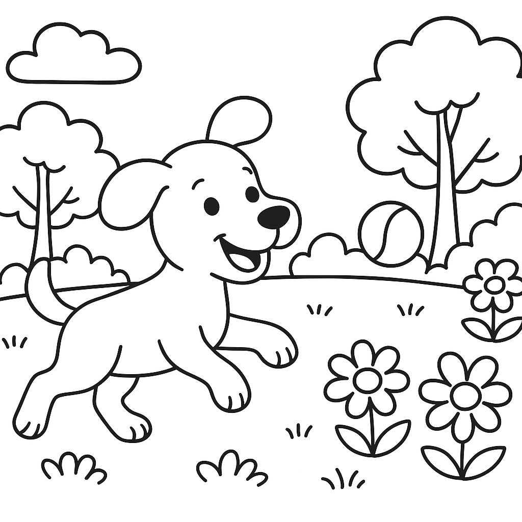 A simple coloring page featuring dog playing fetch in blooming park. Perfect for kids (4-6) with large, bold outlines for a fun coloring experience.