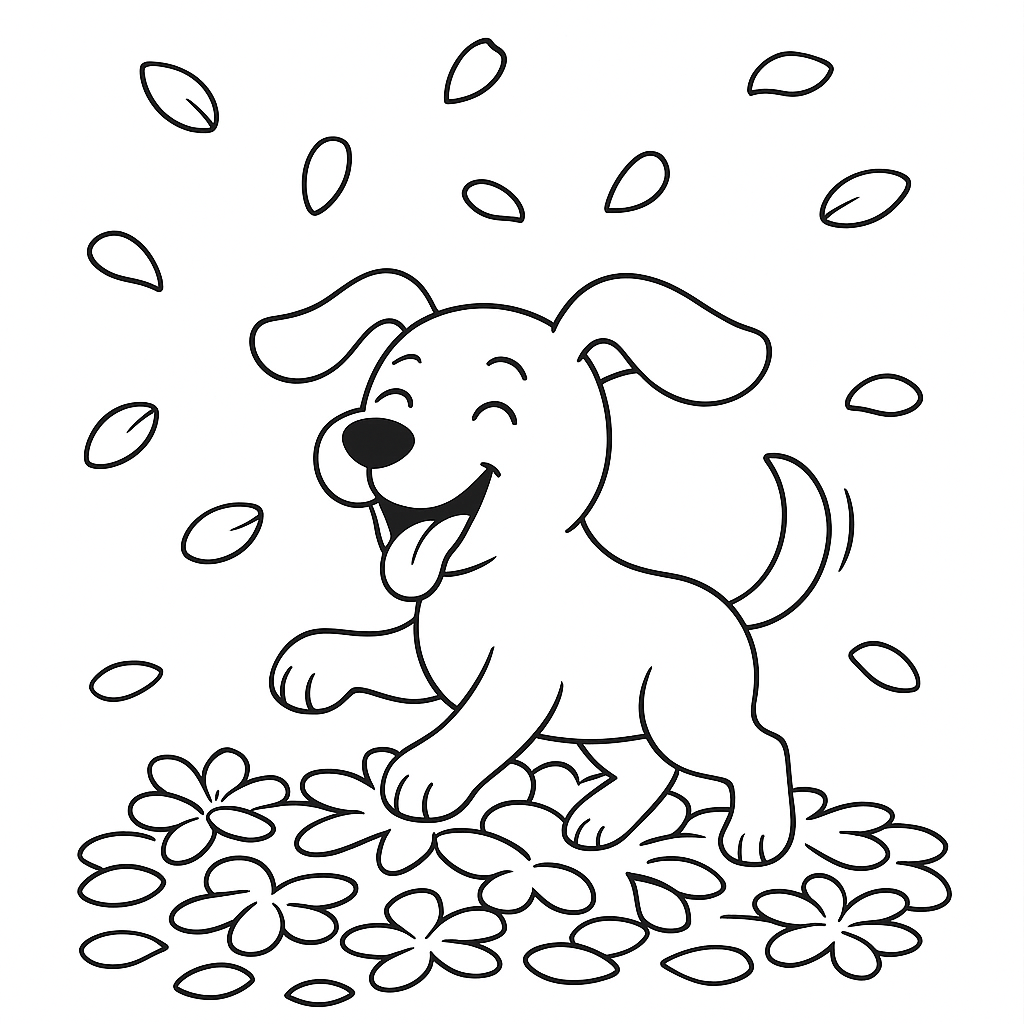 A simple coloring page featuring dog playing in a pile of fallen spring petals. Perfect for kids (4-6) with large, bold outlines for a fun coloring experience.
