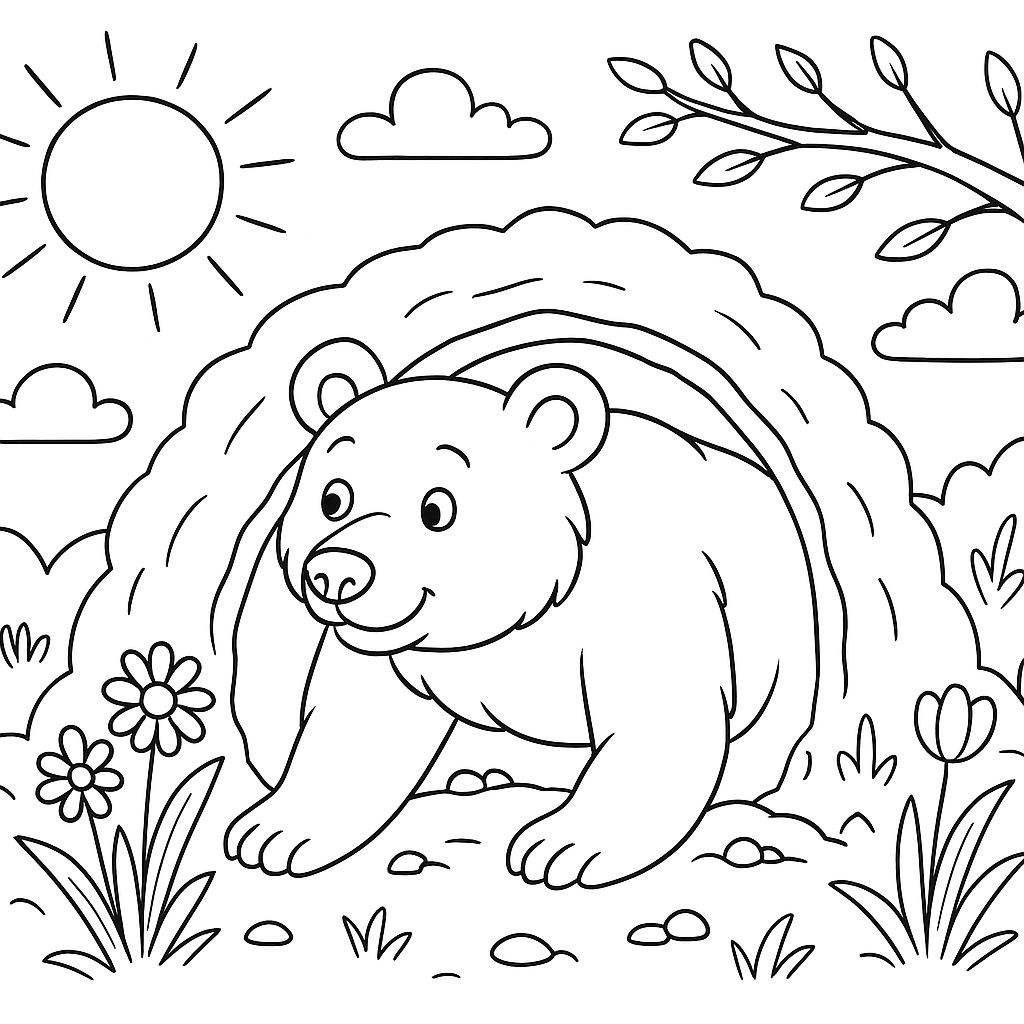 A medium coloring page featuring a bear emerging from hibernation in spring. Perfect for kids (6-9) with moderately detailed outlines for a fun coloring experience.