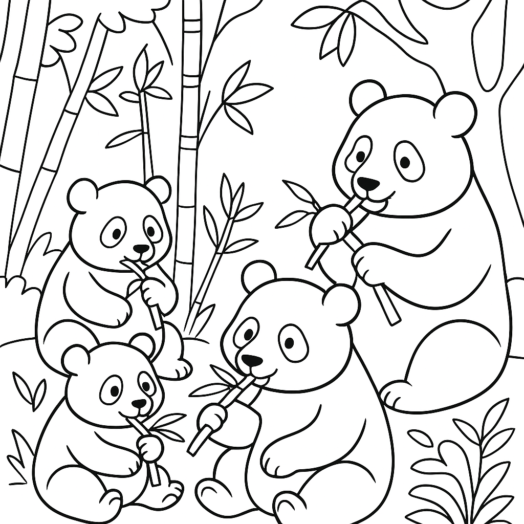 A medium coloring page featuring a family of pandas eating bamboo in a forest. Perfect for kids (4-6) with moderately detailed outlines for a fun coloring experience.