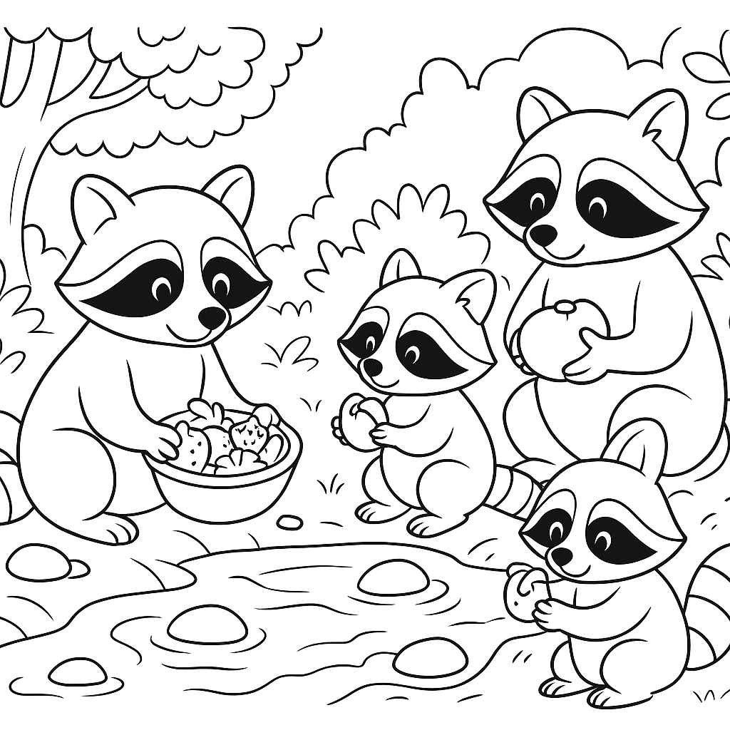 A medium coloring page featuring a family of raccoons washing food by a stream. Perfect for kids (6-9) with moderately detailed outlines for a fun coloring experience.