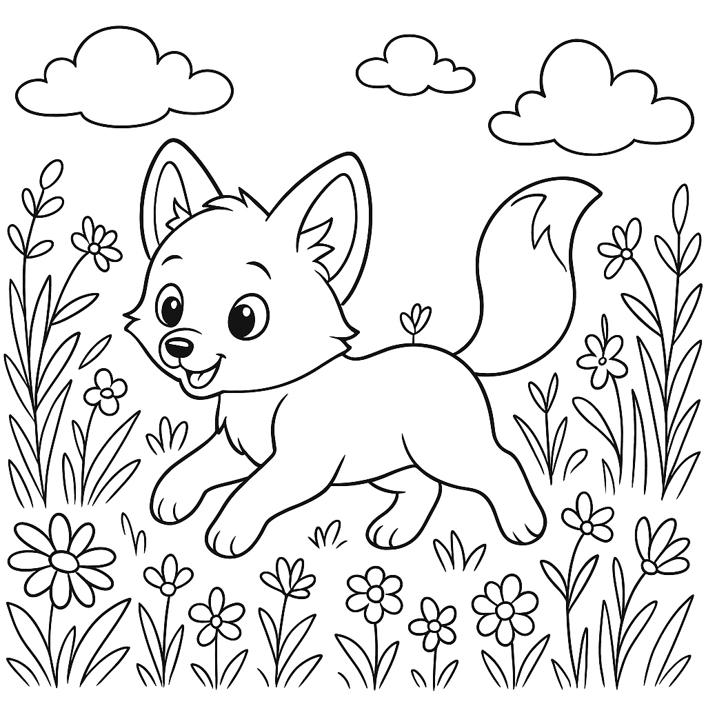 A medium coloring page featuring a red fox kit playing in wildflowers. Perfect for kids (6-9) with moderately detailed outlines for a fun coloring experience.
