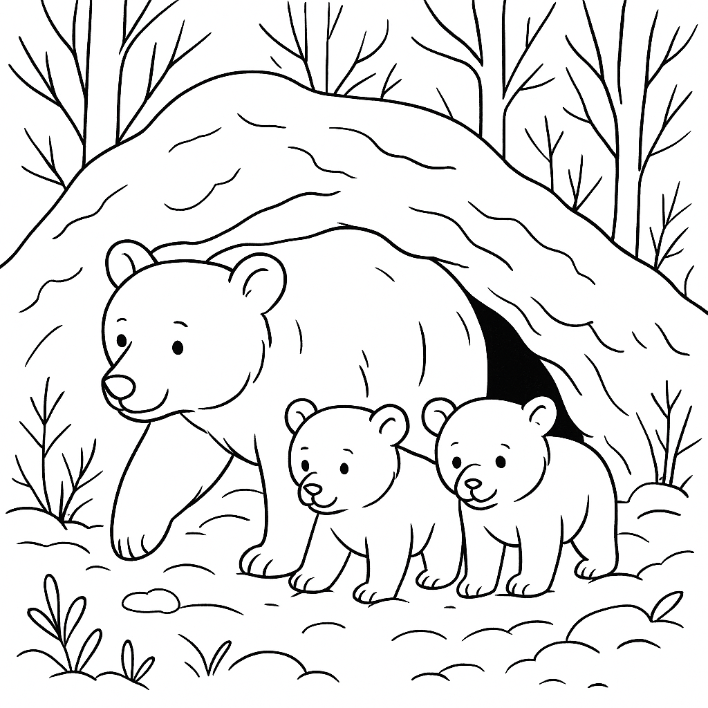 A medium coloring page featuring bear family emerging from winter den. Perfect for kids (6-9) with moderately detailed outlines for a fun coloring experience.