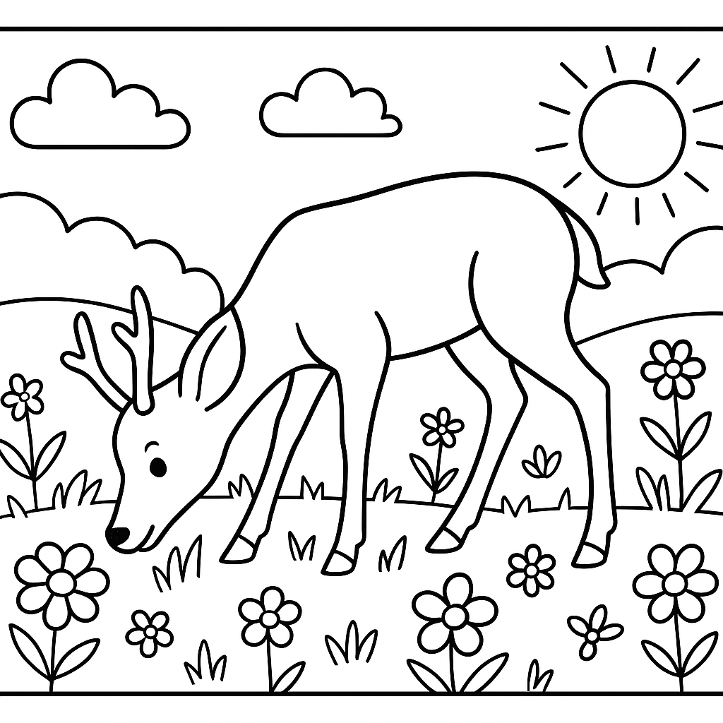 A simple coloring page featuring deer grazing in a meadow of spring wildflowers. Perfect for kids (4-6) with large, bold outlines for a fun coloring experience.