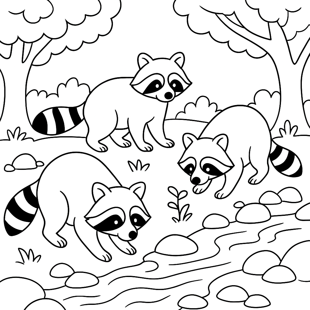 A medium coloring page featuring raccoon family foraging near stream. Perfect for kids (4-6) with moderately detailed outlines for a fun coloring experience.