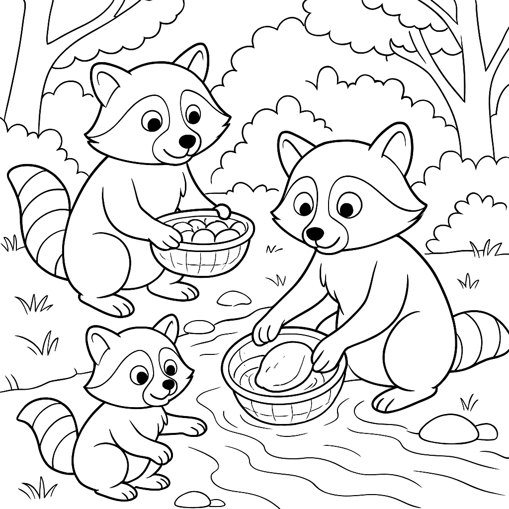 A medium coloring page featuring raccoon family washing food by stream. Perfect for kids (6-9) with moderately detailed outlines for a fun coloring experience.
