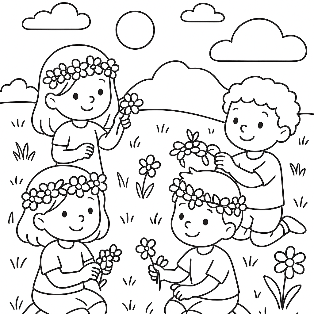 A simple coloring page featuring children making flower crowns in a meadow. Perfect for kids (4-6) with large, bold outlines for a fun coloring experience.