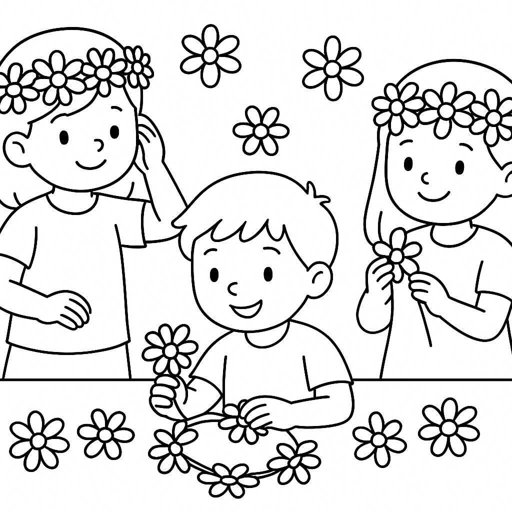 A simple coloring page featuring children making flower crowns with daisies. Perfect for kids (4-6) with large, bold outlines for a fun coloring experience.