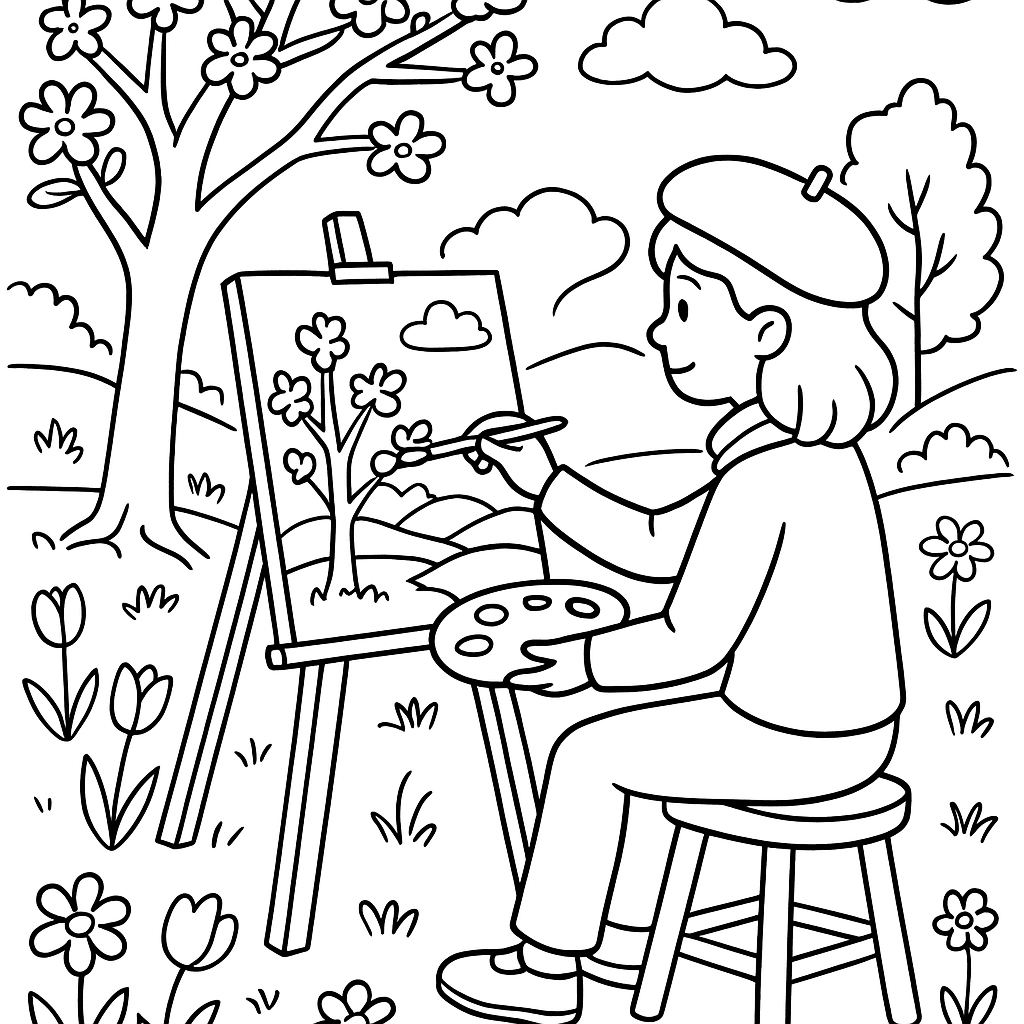 A medium coloring page featuring artist painting spring landscape outdoors. Perfect for kids (6-9) with moderately detailed outlines for a fun coloring experience.