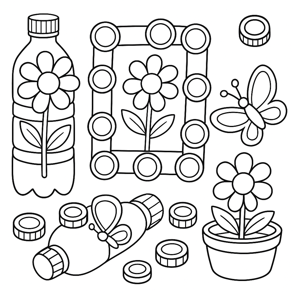 A medium coloring page featuring art project made from plastic bottles and bottle caps. Perfect for kids (6-9) with moderately detailed outlines for a fun coloring experience.