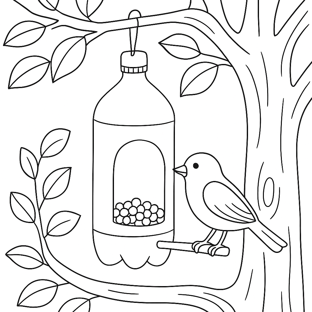 A medium coloring page featuring bird feeder made from recycled plastic bottles hanging in tree. Perfect for kids (6-9) with moderately detailed outlines for a fun coloring experience.