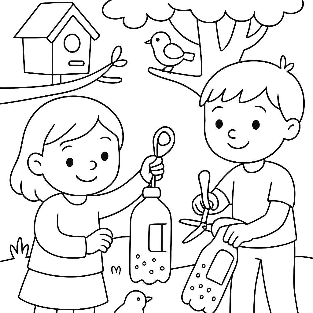 A simple coloring page featuring children making bird feeders from recycled plastic bottles. Perfect for kids (4-6) with large, bold outlines for a fun coloring experience.