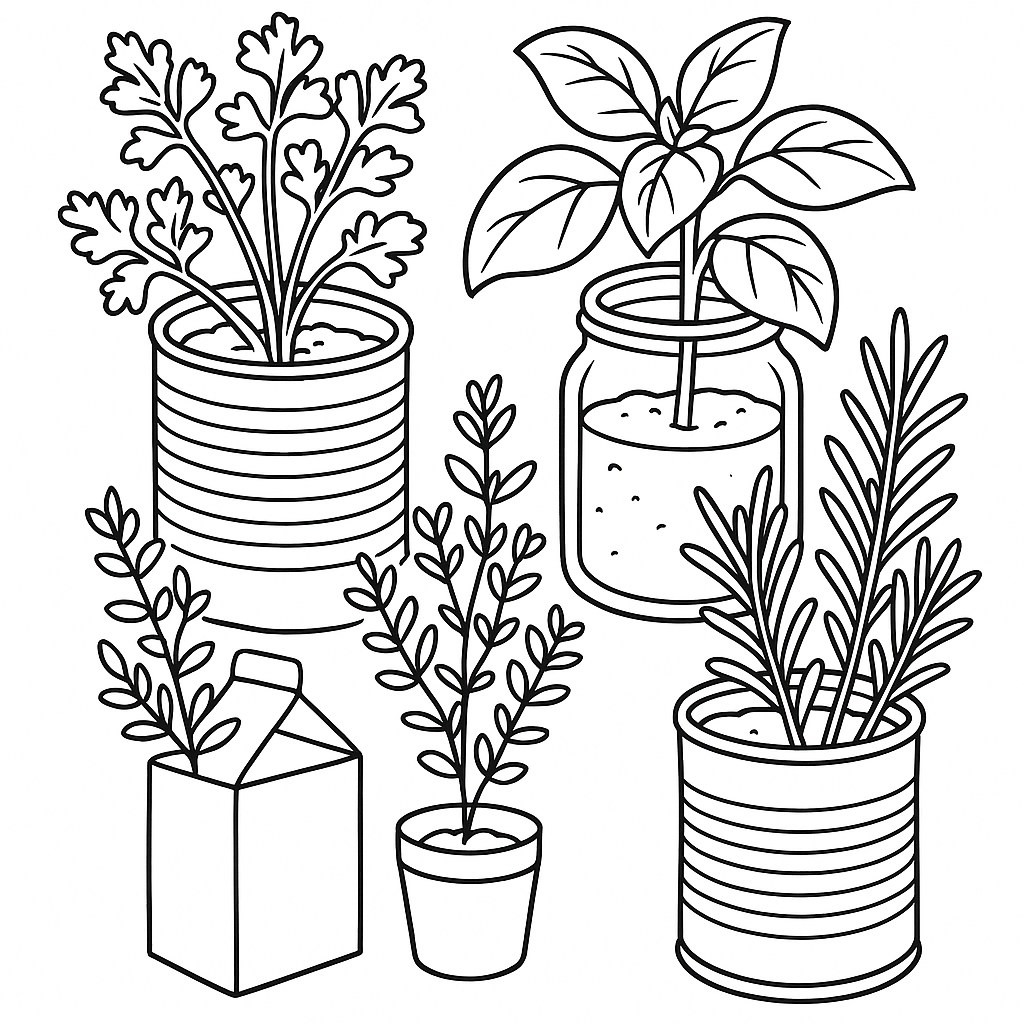 A medium coloring page featuring flower pots made from recycled containers with herbs growing. Perfect for kids (6-9) with moderately detailed outlines for a fun coloring experience.