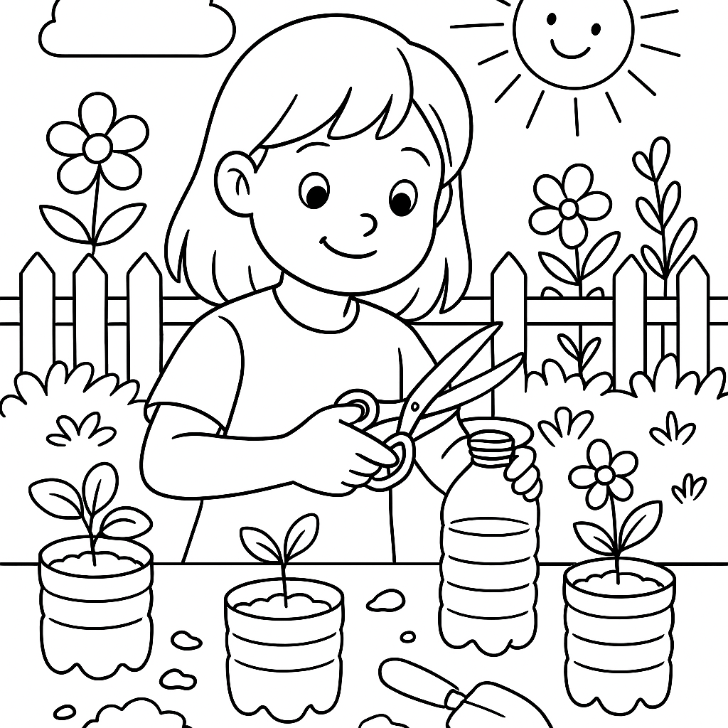 A medium coloring page featuring making planters from recycled bottles for a spring garden. Perfect for kids (6-9) with moderately detailed outlines for a fun coloring experience.