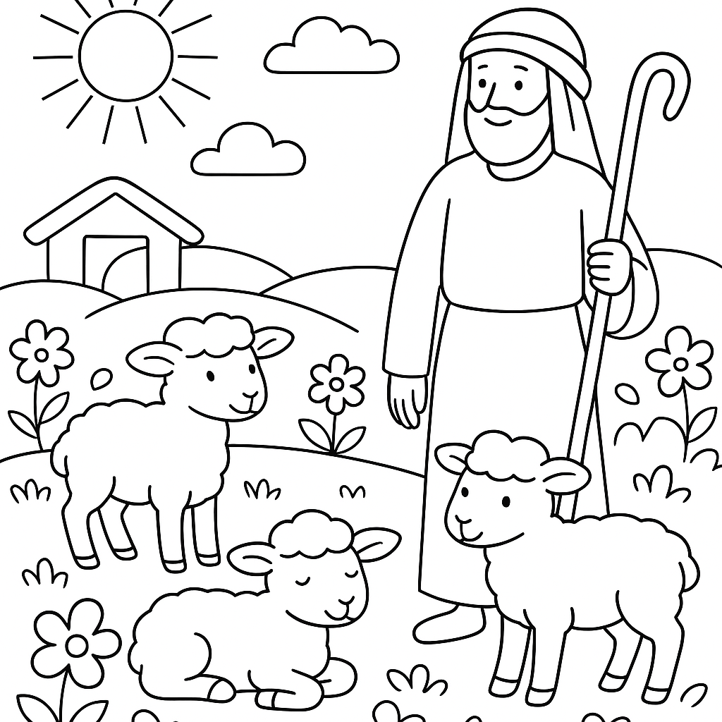 A simple coloring page featuring stable scene with spring lambs and shepherd in blooming field. Perfect for kids (4-6) with large, bold outlines for a fun coloring experience.