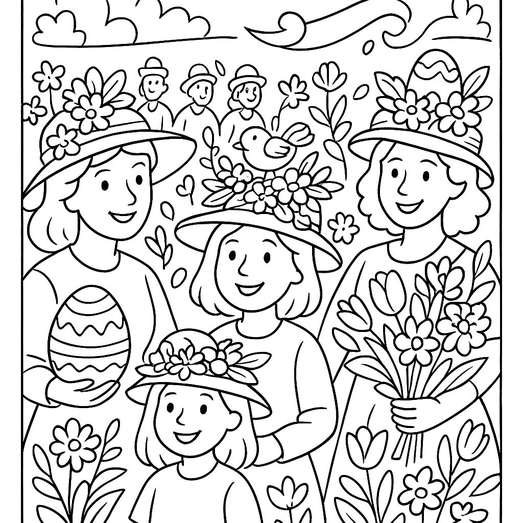 A medium coloring page featuring easter parade with spring bonnets and flowers. Perfect for kids (6-9) with moderately detailed outlines for a fun coloring experience.