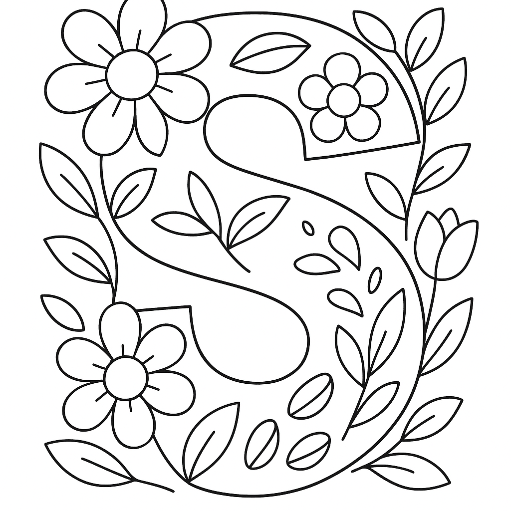 A simple coloring page featuring letter S decorated with spring flowers and seeds. Perfect for kids (4-6) with large, bold outlines for a fun coloring experience.