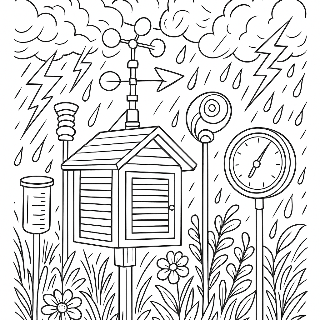 A detailed coloring page featuring a weather station with instruments measuring spring storm data. Perfect for tweens (9-12) with intricate detail for a fun coloring experience.