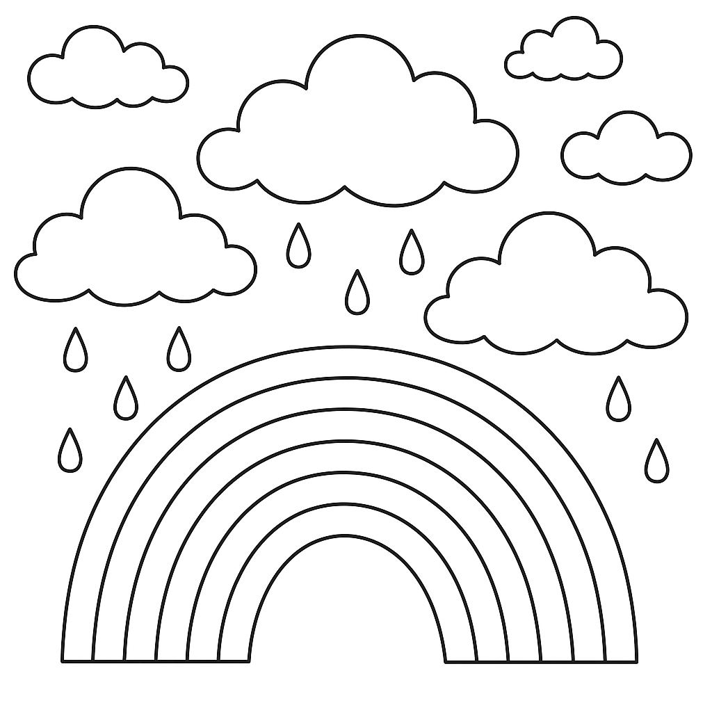 A simple coloring page featuring spring rain clouds with rainbow formation. Perfect for kids (4-6) with large, bold outlines for a fun coloring experience.