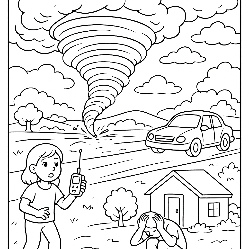 A detailed coloring page featuring tornado formation diagram with safety procedures illustrated. Perfect for tweens (9-12) with intricate detail for a fun coloring experience.