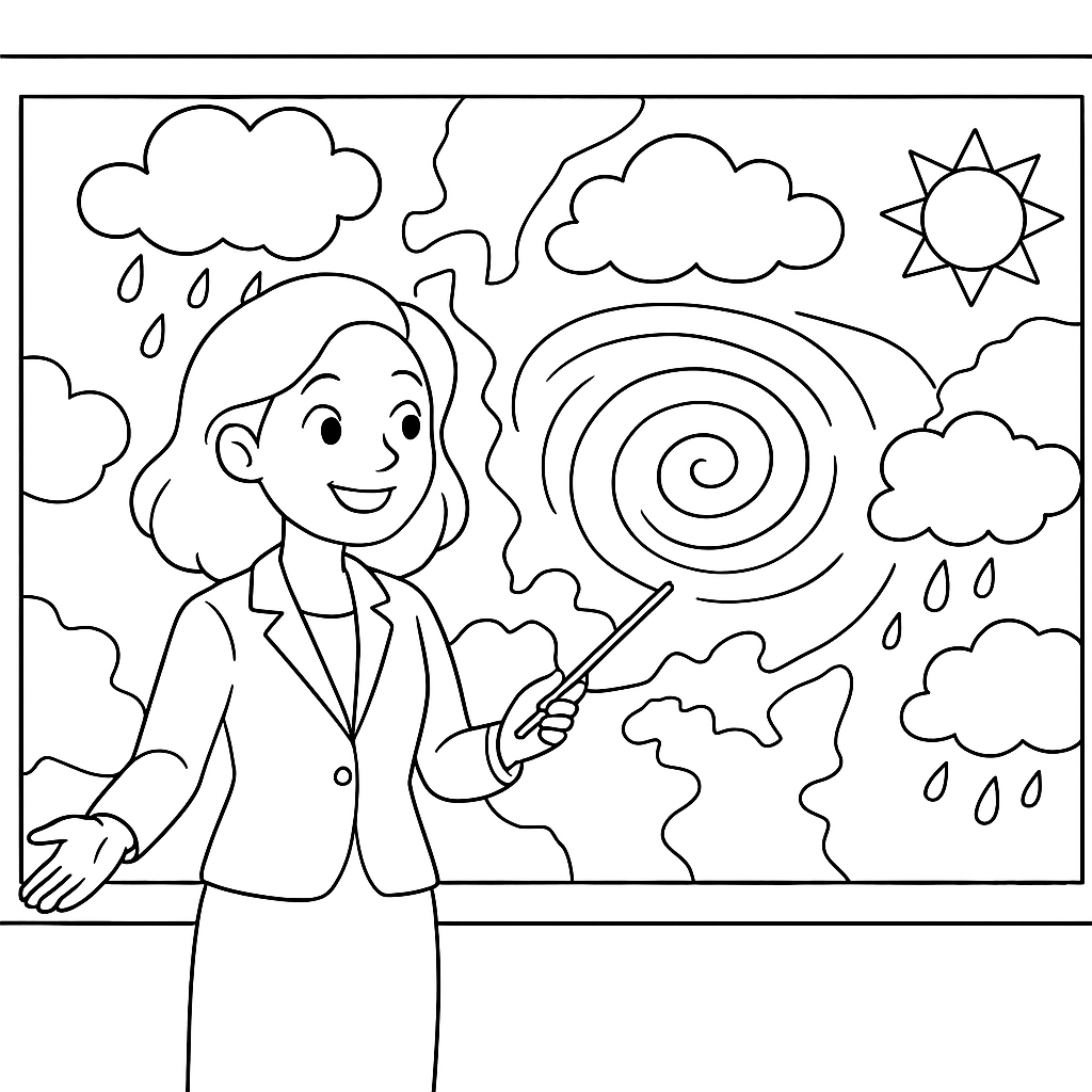 A medium coloring page featuring weather forecaster explaining spring storm systems. Perfect for kids (6-9) with moderately detailed outlines for a fun coloring experience.