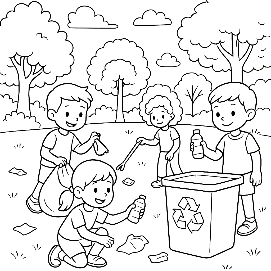 A medium coloring page featuring children picking up litter in a park with recycling bins. Perfect for kids (6-9) with moderately detailed outlines for a fun coloring experience.