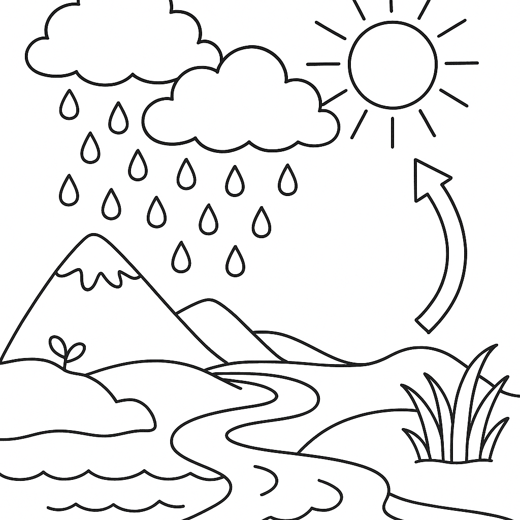 A medium coloring page featuring water cycle diagram with rain, clouds, and evaporation. Perfect for kids (6-9) with moderately detailed outlines for a fun coloring experience.