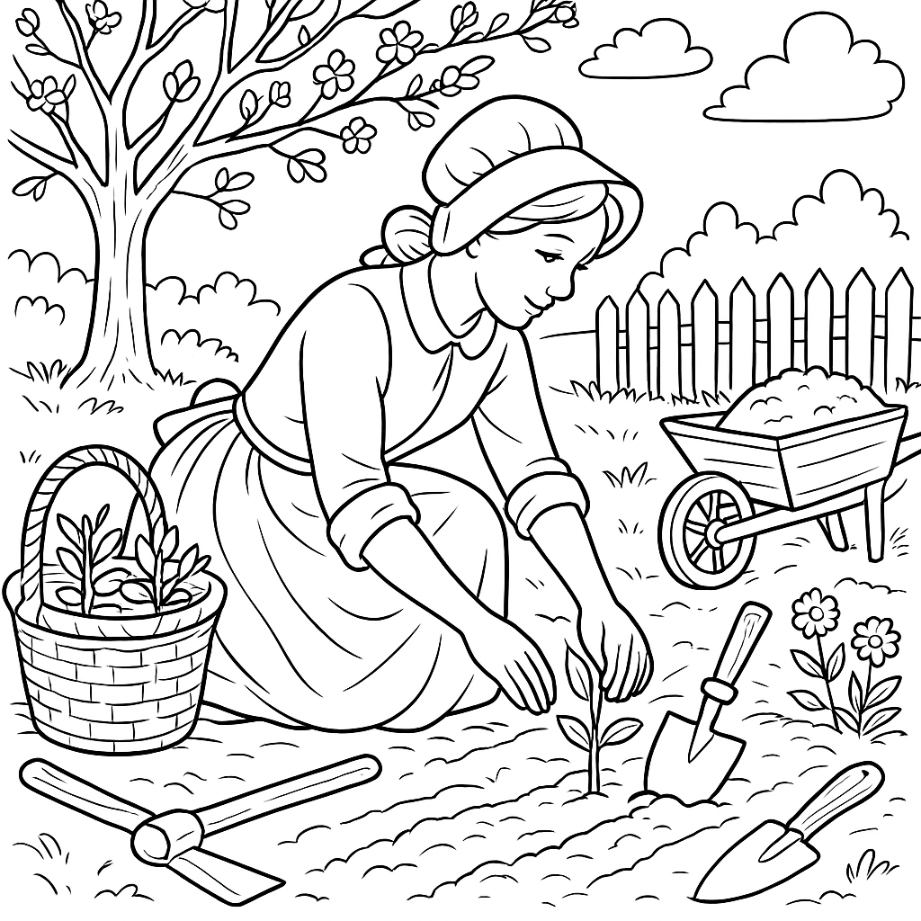 A detailed coloring page featuring colonial spring planting with historical tools. Perfect for tweens (9-12) with intricate detail for a fun coloring experience.