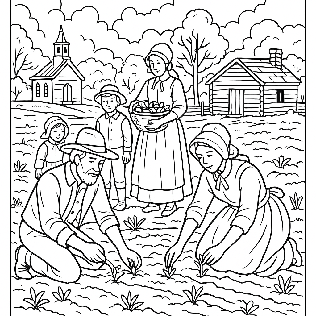 A detailed coloring page featuring early settlers planting their first spring crops in America. Perfect for tweens (9-12) with intricate detail for a fun coloring experience.