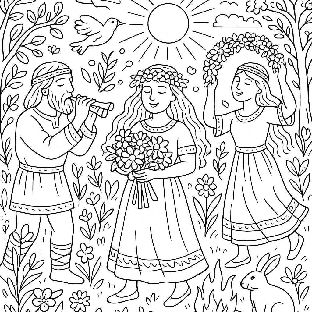 A detailed coloring page featuring how ancient people celebrated spring equinox. Perfect for tweens (9-12) with intricate detail for a fun coloring experience.