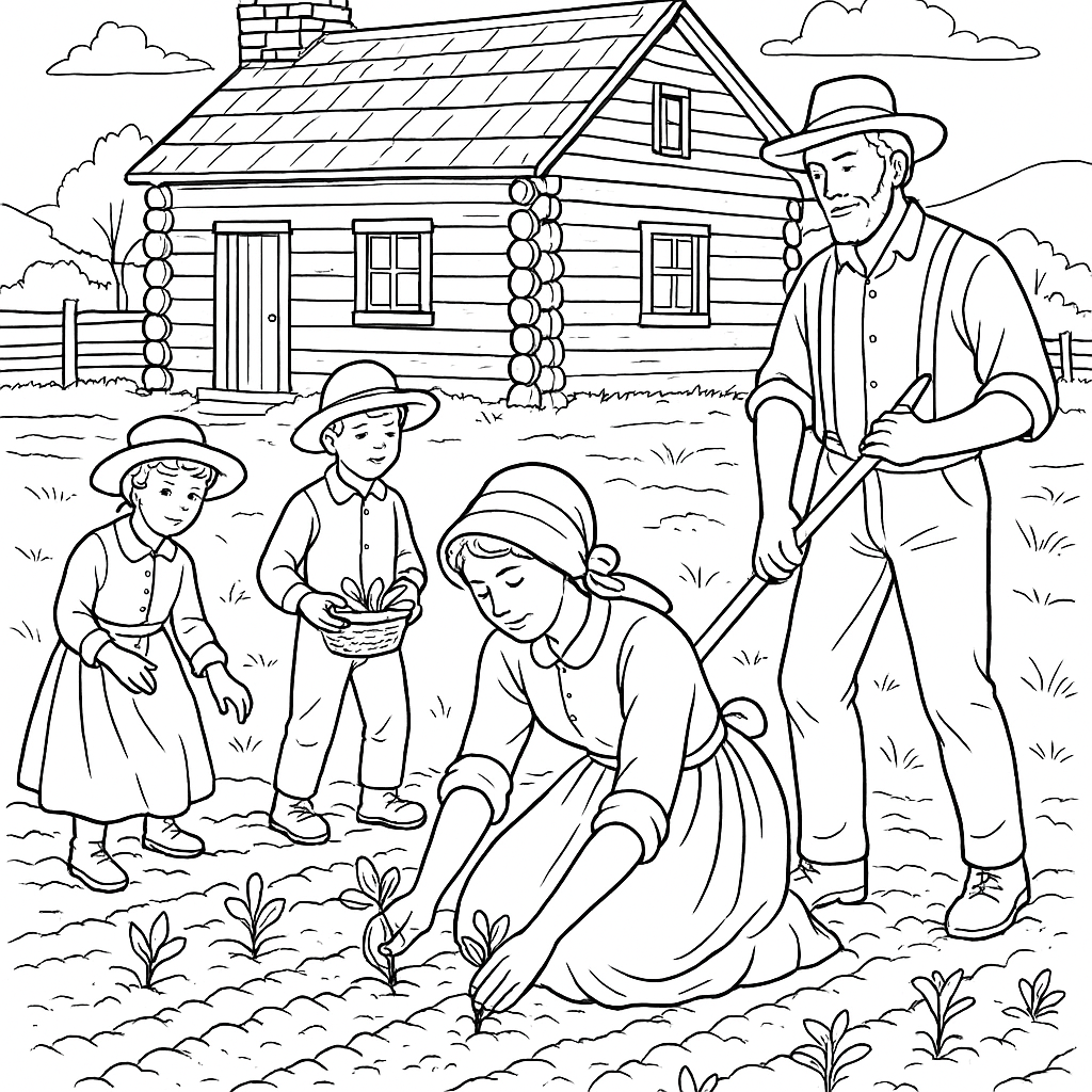 A detailed coloring page featuring pioneer family planting crops on frontier homestead. Perfect for tweens (9-12) with intricate detail for a fun coloring experience.
