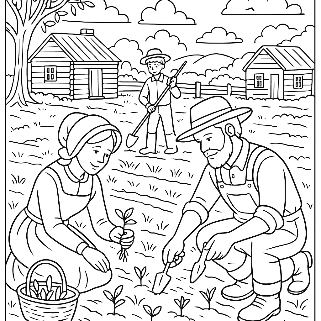 A detailed coloring page featuring pioneers planting crops in spring prairie settlement. Perfect for tweens (9-12) with intricate detail for a fun coloring experience.