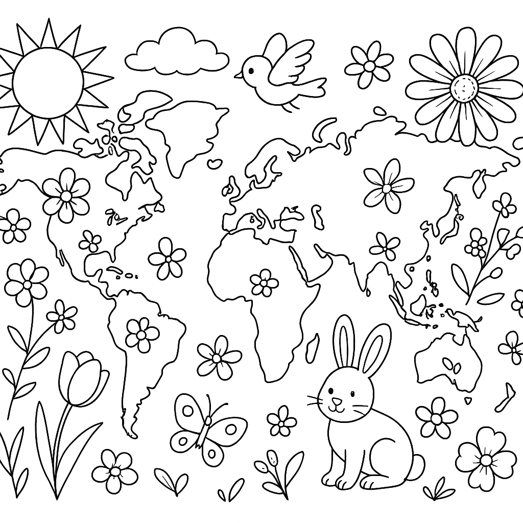 A medium coloring page featuring world map showing spring around the globe. Perfect for kids (6-9) with moderately detailed outlines for a fun coloring experience.