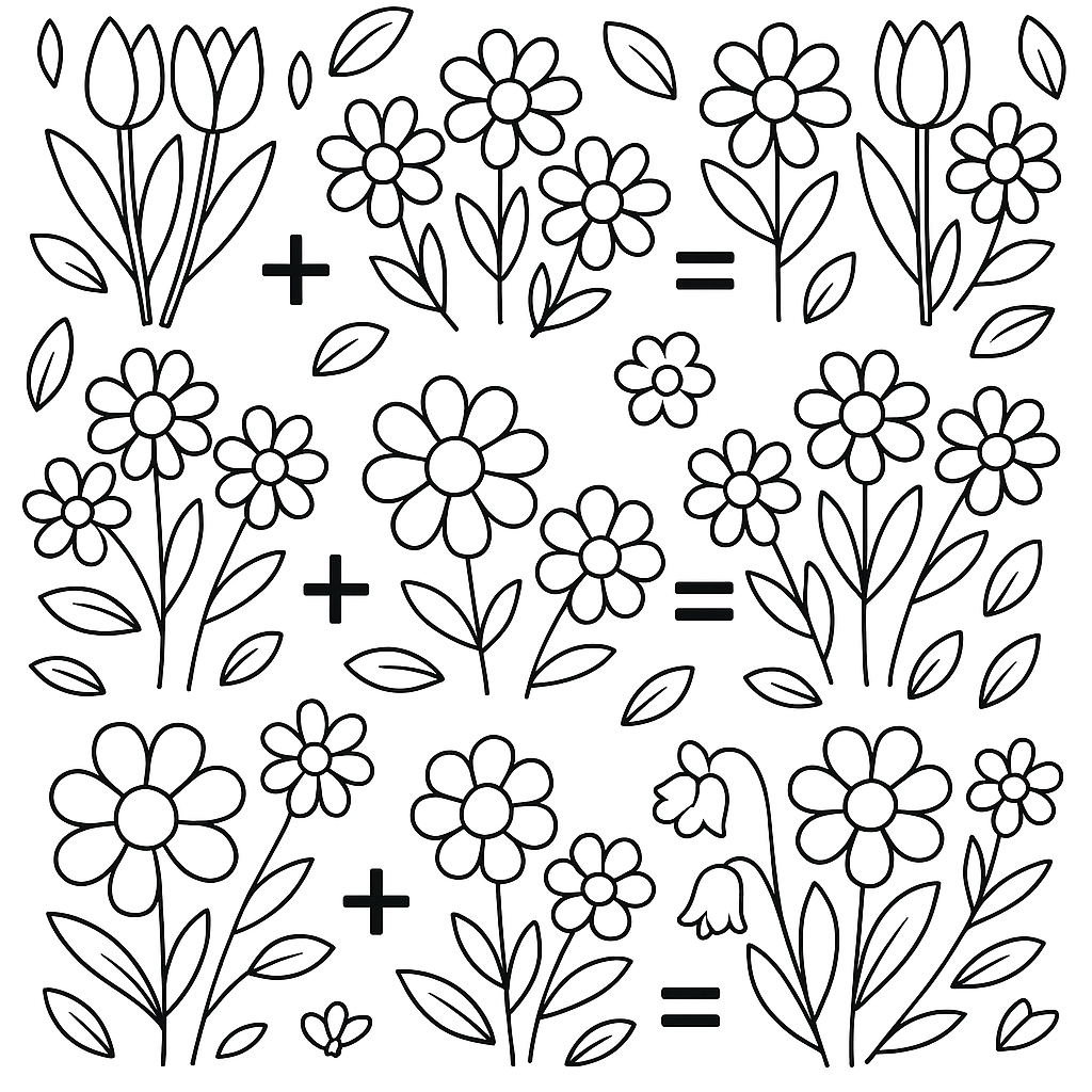 A medium coloring page featuring addition problems using spring flower counting. Perfect for kids (6-9) with moderately detailed outlines for a fun coloring experience.
