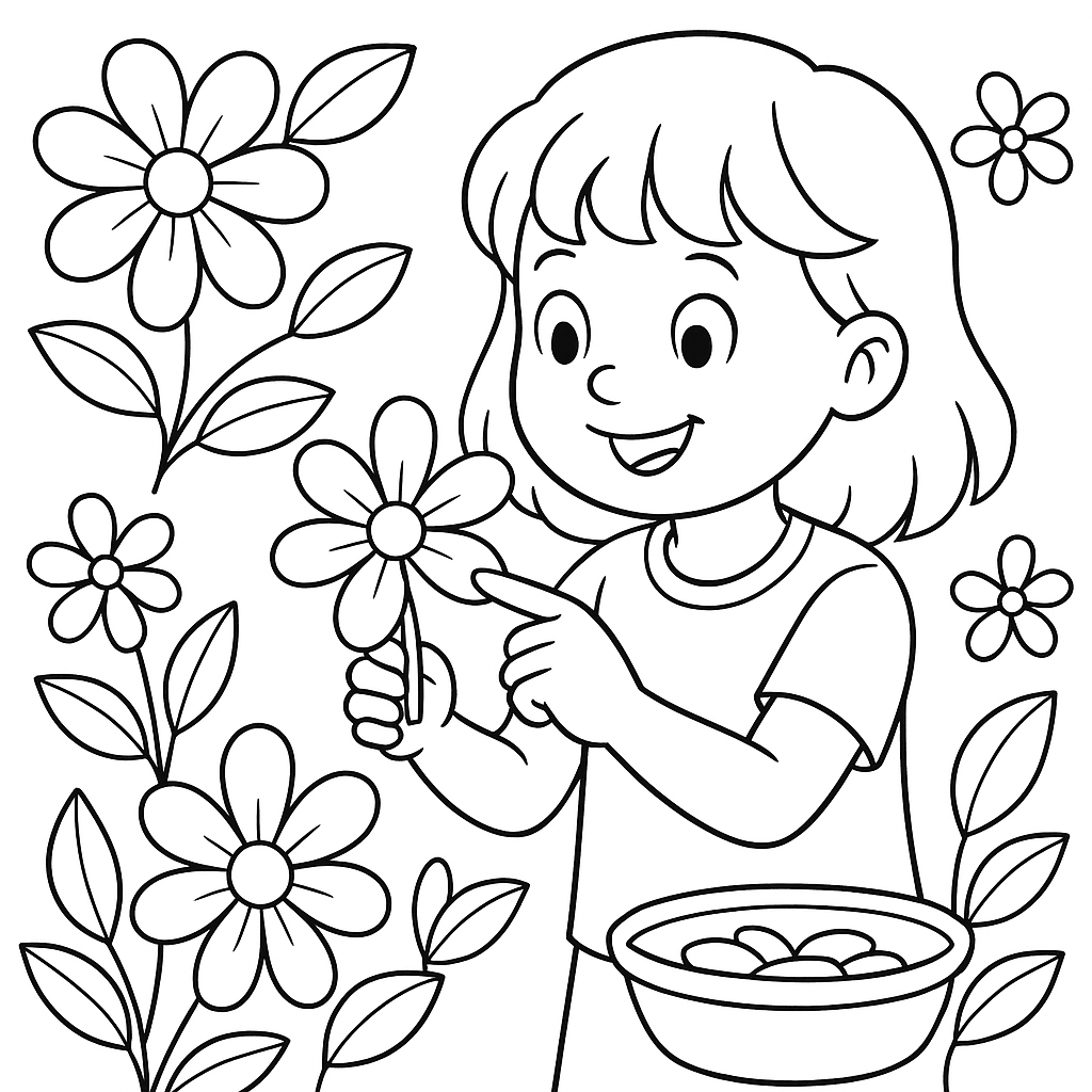 A medium coloring page featuring counting petals on flowers for basic multiplication. Perfect for kids (6-9) with moderately detailed outlines for a fun coloring experience.