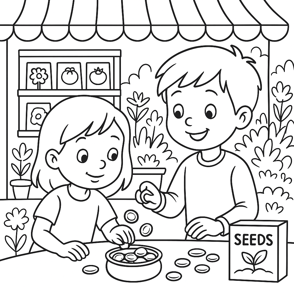 A medium coloring page featuring children counting coins to buy seeds at garden center. Perfect for kids (6-9) with moderately detailed outlines for a fun coloring experience.