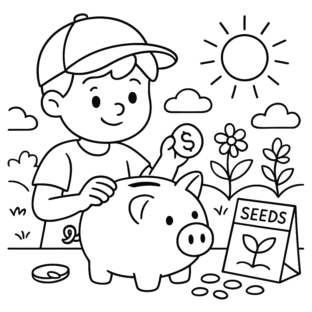 A medium coloring page featuring saving money to buy seeds for a garden. Perfect for kids (6-9) with moderately detailed outlines for a fun coloring experience.