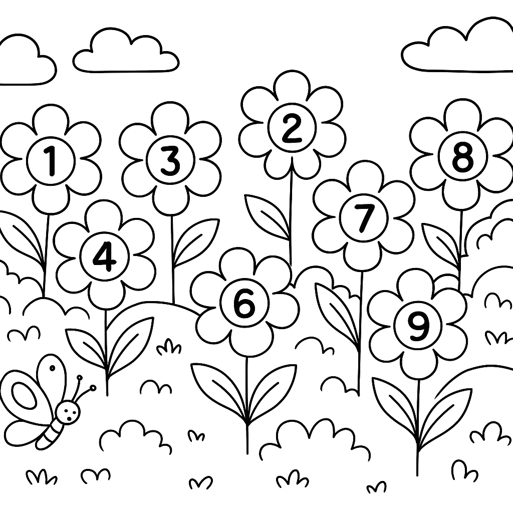 A simple coloring page featuring counting flowers from 1 to 10 in a garden scene. Perfect for kids (4-6) with large, bold outlines for a fun coloring experience.