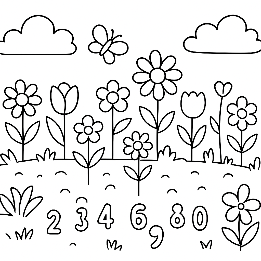 A simple coloring page featuring counting spring flowers from 1 to 10 in a garden scene. Perfect for toddlers (2-4) with large, bold outlines for a fun coloring experience.