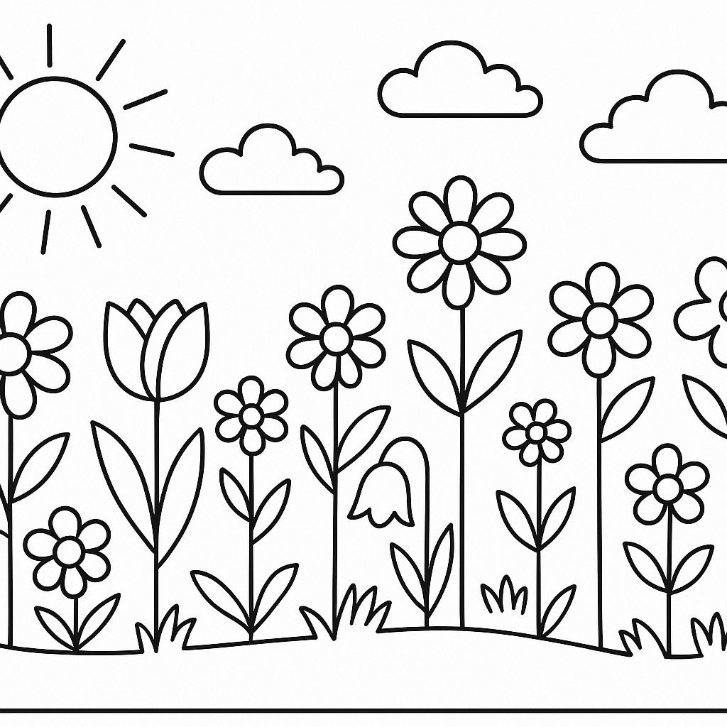 A simple coloring page featuring counting spring flowers from 1 to 10. Perfect for kids (4-6) with large, bold outlines for a fun coloring experience.