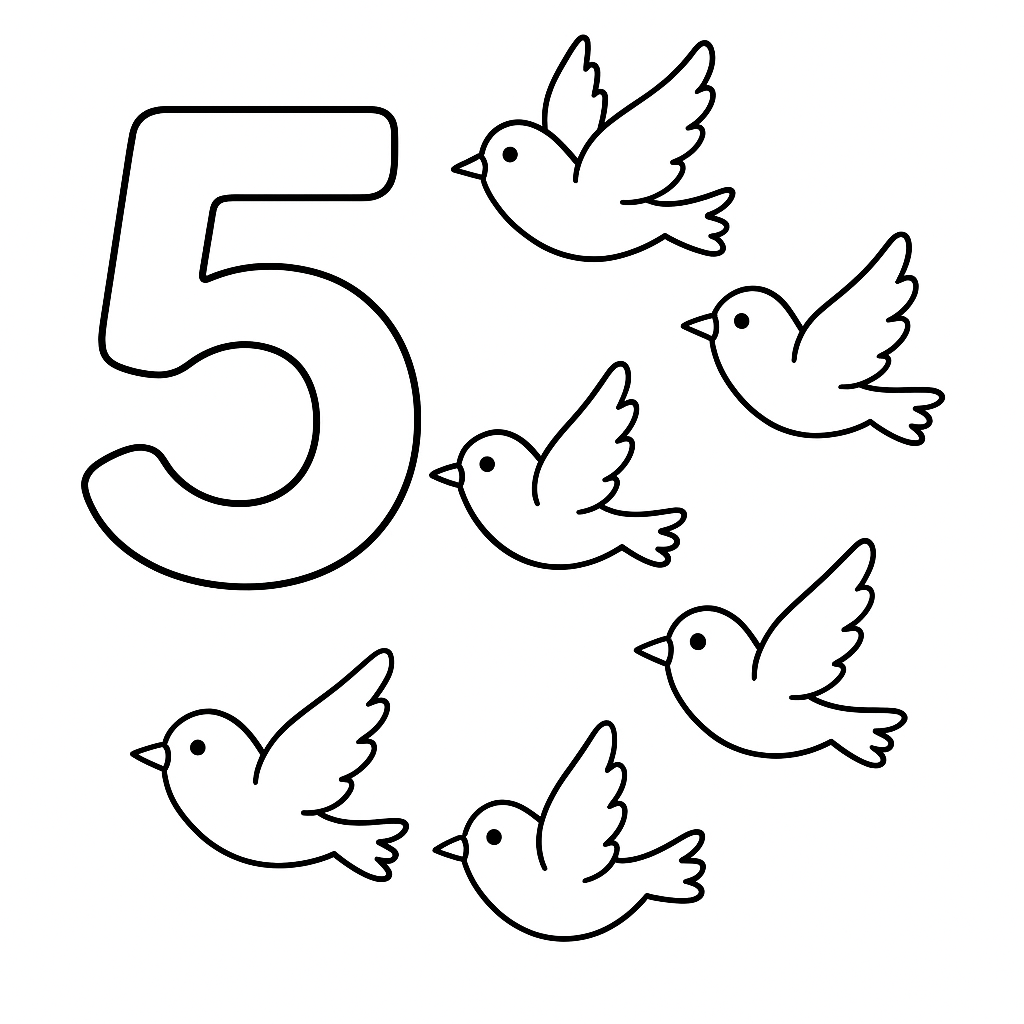 A simple coloring page featuring number 5 with five flying birds to count. Perfect for kids (4-6) with large, bold outlines for a fun coloring experience.