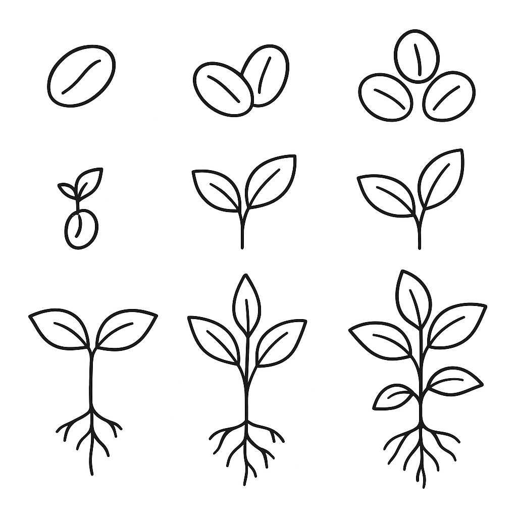 A simple coloring page featuring number sequence 1-10 with corresponding spring seeds to count. Perfect for kids (4-6) with large, bold outlines for a fun coloring experience.