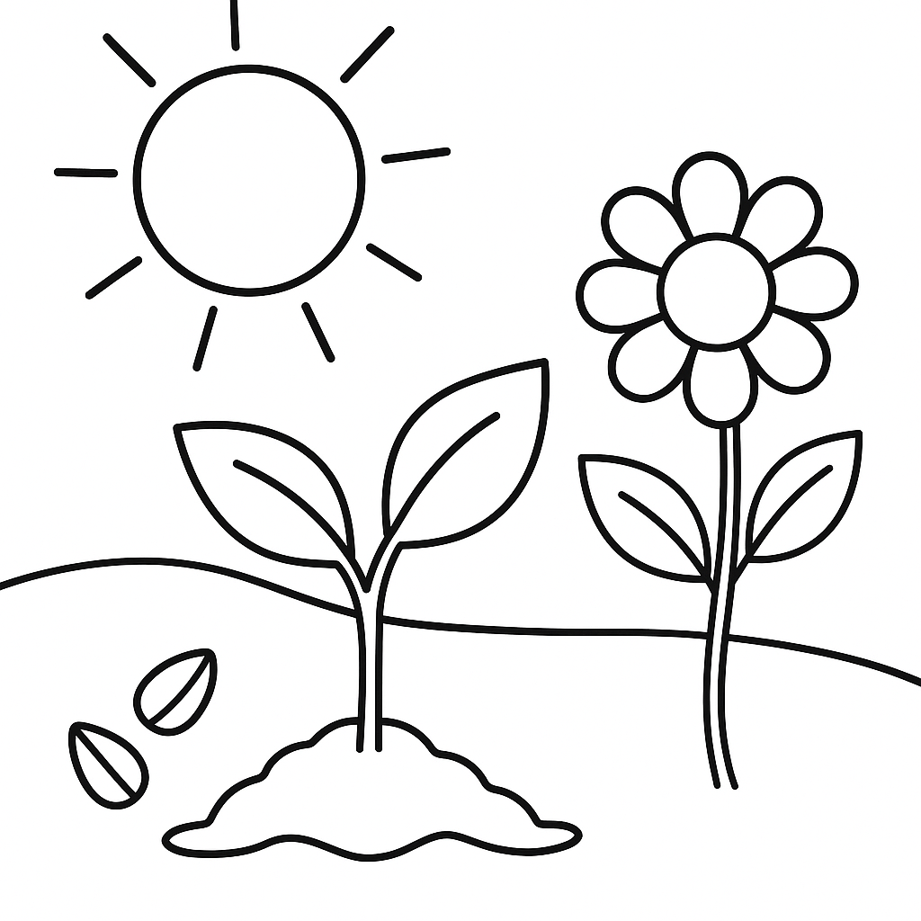 A simple coloring page featuring letter S sound page with sun, seeds, and spring illustrations. Perfect for kids (4-6) with large, bold outlines for a fun coloring experience.